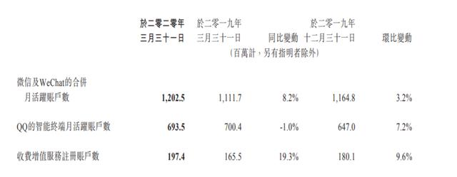 截至2020年3月31日,微信及 WeChat 的合并月活跃账户数已高达12.02亿,同比增长8.2%,环比增长3.2%。不管是同比涨幅,还是环比涨幅,都高于上期。