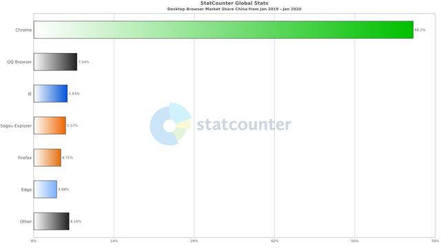 比如,根据StatCounter Global Stats统计的数据显示,在2019年7月份的时候,QQ浏览器在中国市场拿下了11.18%的市场份额,此时Chrome的份额仅为50.56%。而半年后,这个数字就此消彼长到了QQ浏览器的7.54%和Chrome的66.2%。