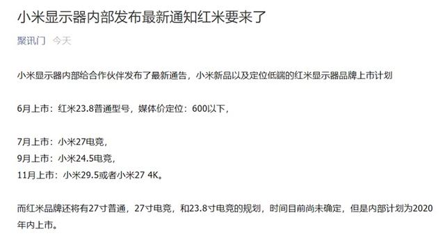 IT之家5月11日消息 根据聚讯门的消息,小米显示器内部给合作伙伴发布了最新通告,小米新品以及定位低端的红米显示器品牌上市计划也曝光了。
