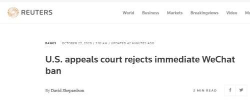 英国路透社刚刚消息称,美国一上诉法院当地时间26日在一份裁定中驳回了美国司法部一项请求,即美司法部此前请求允许立即禁止苹果和谷歌在美应用商店提供微信下载服务。 报道称,由美国联邦第九巡回上诉法院3名法官组成的小组裁定认为,政府没有证明自身将“在上诉未决期间遭受迫在眉睫的、无法弥补...